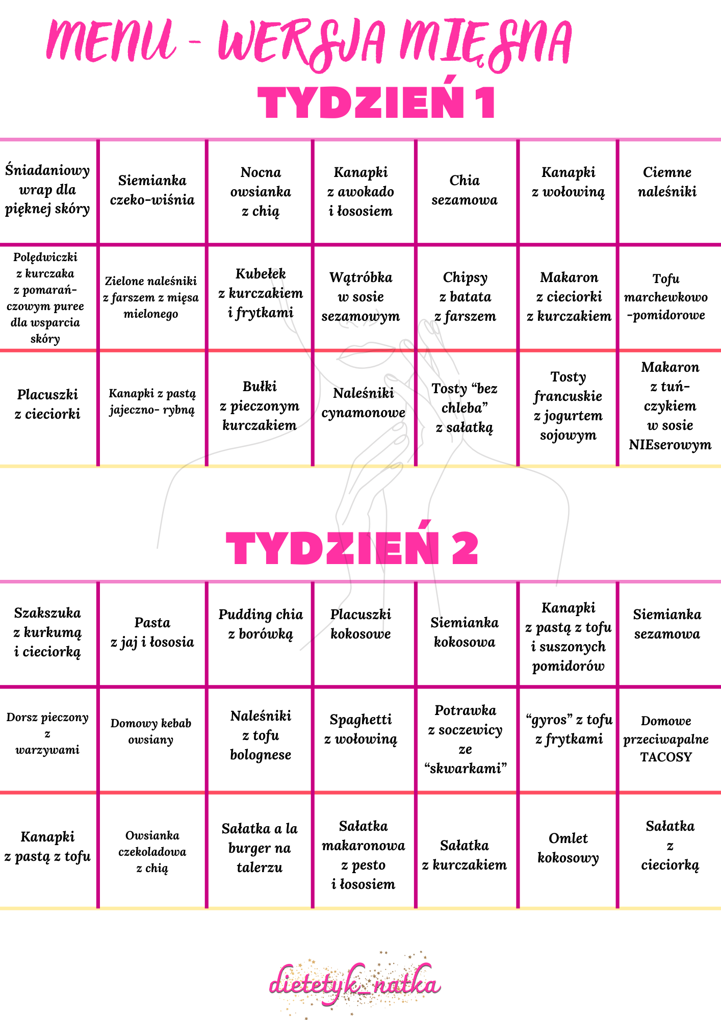 Jadłospis znajdziesz w wersji mięsnej i bezmięsnej (bez kurczaka, wołowiny, podrobów itp, ale są w nim ryby i jaja).